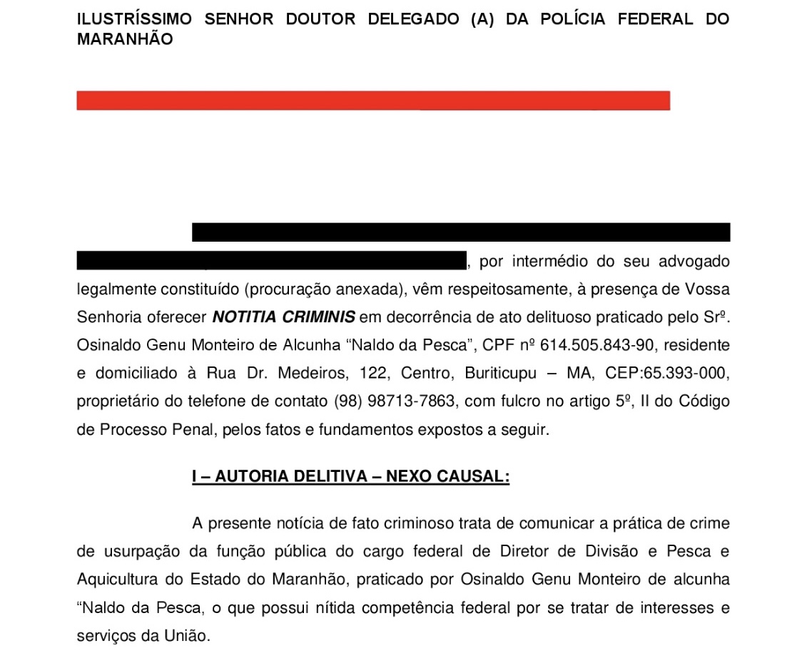 Conforme informações de dirigentes de entidades, de militantes que atuam na área da pesca no conteúdo da representação formulada junto a PF, a Superintendência Federal do Maranhão entregou a sua interlocução entre colônias, associações e sindicatos pesqueiros a Osinaldo Genu Monteiro, popularmente conhecido como “Naldo da Pesca” e que segundo consultas realizadas no portal da transparência do Governo Federal e Diário Oficial da União não tem qualquer portaria ou nomeação para atuar na área utilizando o nome do órgão federal, conforme representação feita na PF.