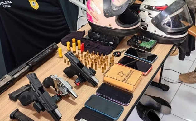 Durante o cumprimento dos mandados, a polícia apreendeu na residência dos suspeitos, duas pistolas calibre 9mm e .380, um revólver calibre 38, uma espingarda calibre 12 de repetição com cano cerrado, e muitas munições.