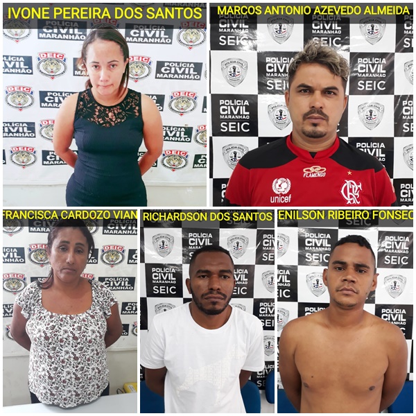 Na ação policial foram presos Ivone Pereira dos Santos, Francisca Cardoso Viana (Thaís), Marcos Antônio Azevedo Almeida (Marquinhos), Genilson Ribeiro Fonseca e Richardson dos Santos, vulgo Tatá. Todos são integrantes de uma organização criminosa responsável por distribuir drogas por alguns bairros da capital maranhense.