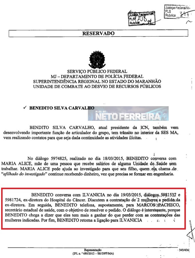 A Operação Sermão aos Peixes, desencadeada pela Polícia Federal no Maranhão, respingou até no governo Flávio Dino. Interceptações telefônicas, captadas em março deste ano, revelam que Benedito Silva Carvalho, presidente do Instituto de Cidadania e Natureza (ICN), conversa com o secretário de Estado da Saúde (SES), Marcos Pacheco, para tratar assuntos relacionados a contratações de duas mulheres.