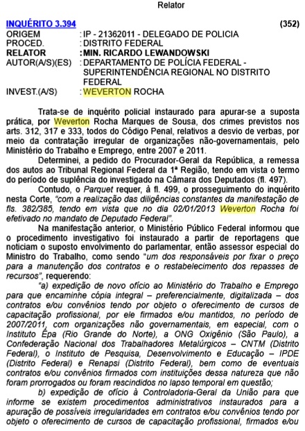 Os relações perigosas das Ongs motivou o ministro Ricardo Lewandowski a pedir uma amplicação na investigação sobre o pedetista que vem sendo alvo no inquerito que apura corrupção ativa e corrupção passiva e crime de peculato – desvio de recursos públicos.