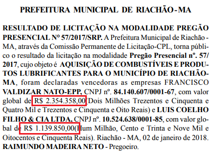 R$ 3.494.208,00 milhões. Esse é o valor exato que a Prefeitura de Riachão vai pagar para os postos de combustíveis Nato e Universal, ambos localizados naquela cidade.