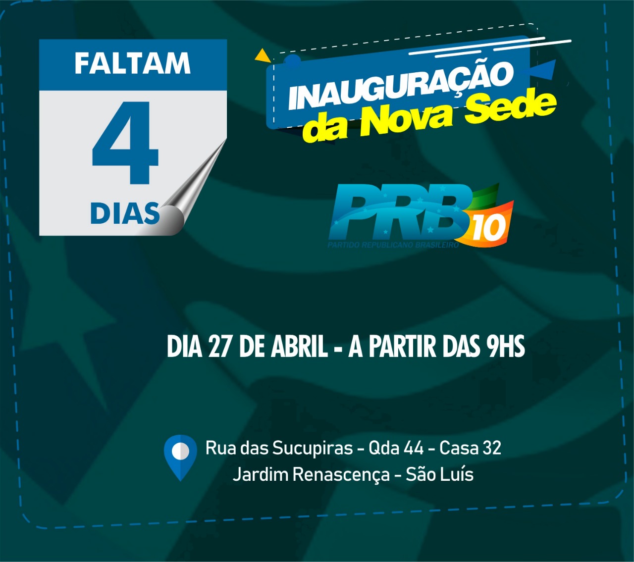 O Partido Republicano Brasileiro (PRB) vai ganhar uma nova sede em São Luís. A solenidade de inauguração ocorrerá neste sábado (27) às 9h, no Jardim Renascença, e contará com grande lideranças políticas do Maranhão.