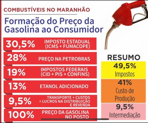 Abaixo é possível ver os detalhes da formação de preço do combustível, que engloba impostos estaduais, federais, custos de produtos, e reajuste da Petrobras.