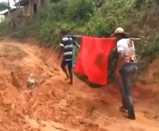 Imagem enviada para a reportagem do Blog do Neto Ferreira mostra moradores carregando uma paciente em estado grave dentro de uma rede do Povoado Maravilha para o hospital municipal, pois não tinha ambulância disponível para atender a ocorrência.