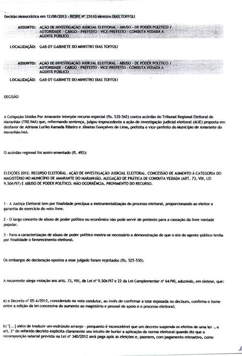 Após várias tentativas da oposição em tentar cassar prefeita de Amarante do Maranhão, Adriana Luriko Kamada Ribeiro e o vice Jônatas Gonçalves de Lima, o ministro Dias Toffoli descartou a hipótese e julgou improcedente a ação de investigação.