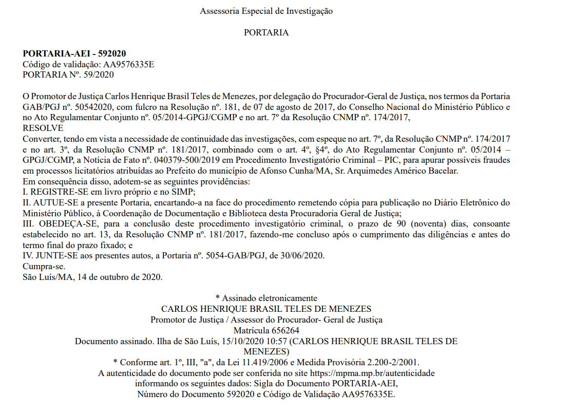 O prefeito de Afonso Cunha, Arquimedes Américo Bacelar, está no bojo de um inquérito criminal instaurado pela Procuradoria Geral de Justiça (PGJ).