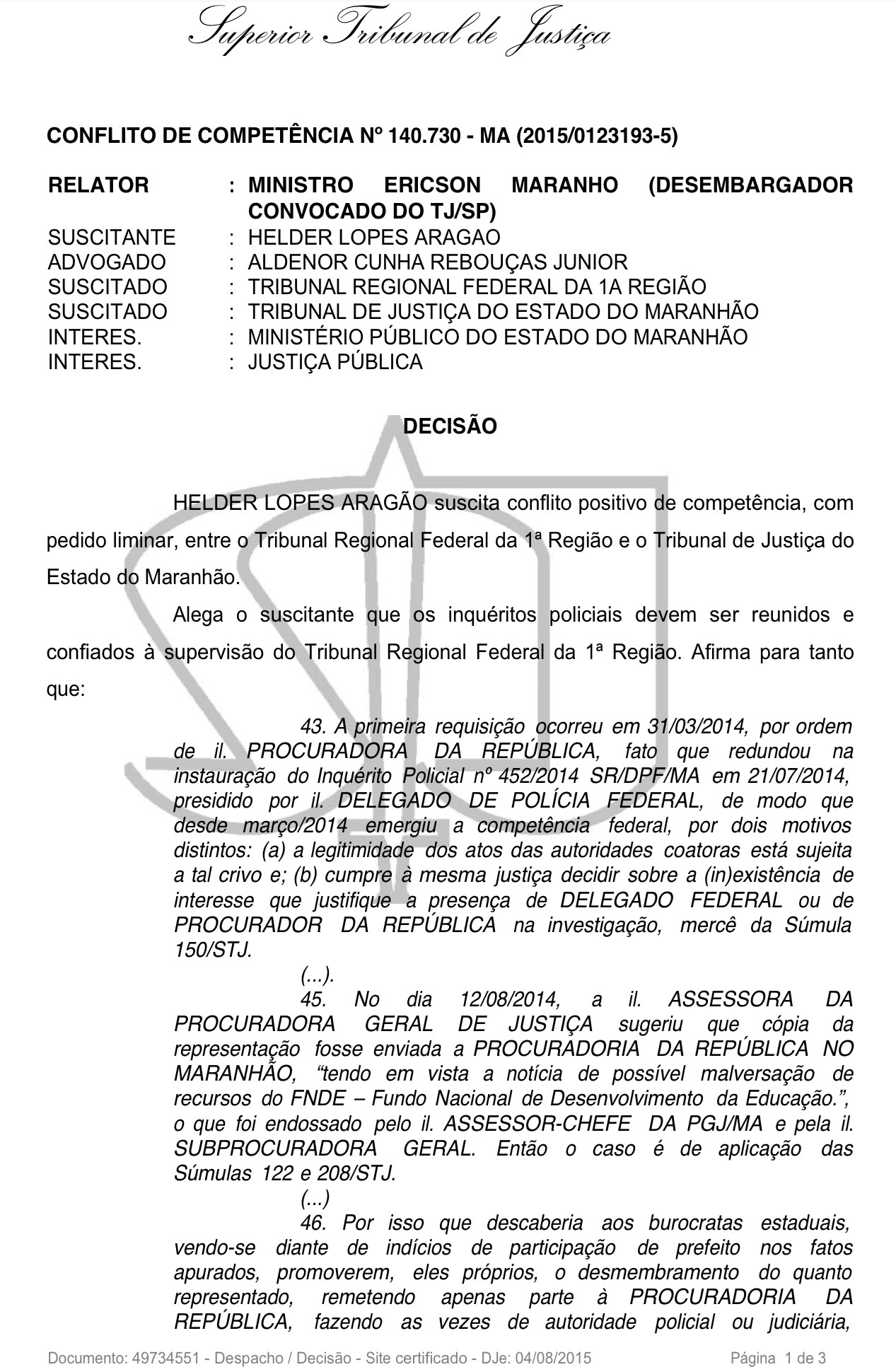 Recentemente, diante da farta documentação probante, o prefeito maranhense sofreu derrota no Superior Tribunal de Justiça – STJ, em decisão proferida pelo ministro Ericson Maranhão. O engraçado é que mesmo tendo decisão favorável proferida pelo desembargador Luiz Gonzaga, Helder Aragão ajuizou junto ao STJ uma ação arguindo conflito de competência entre o Tribunal Federal da 1ª Região e o Tribunal de Justiça do Estado.
