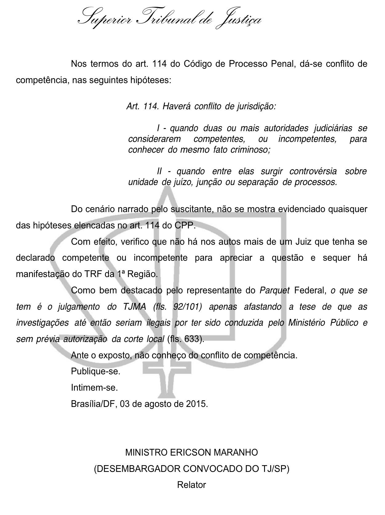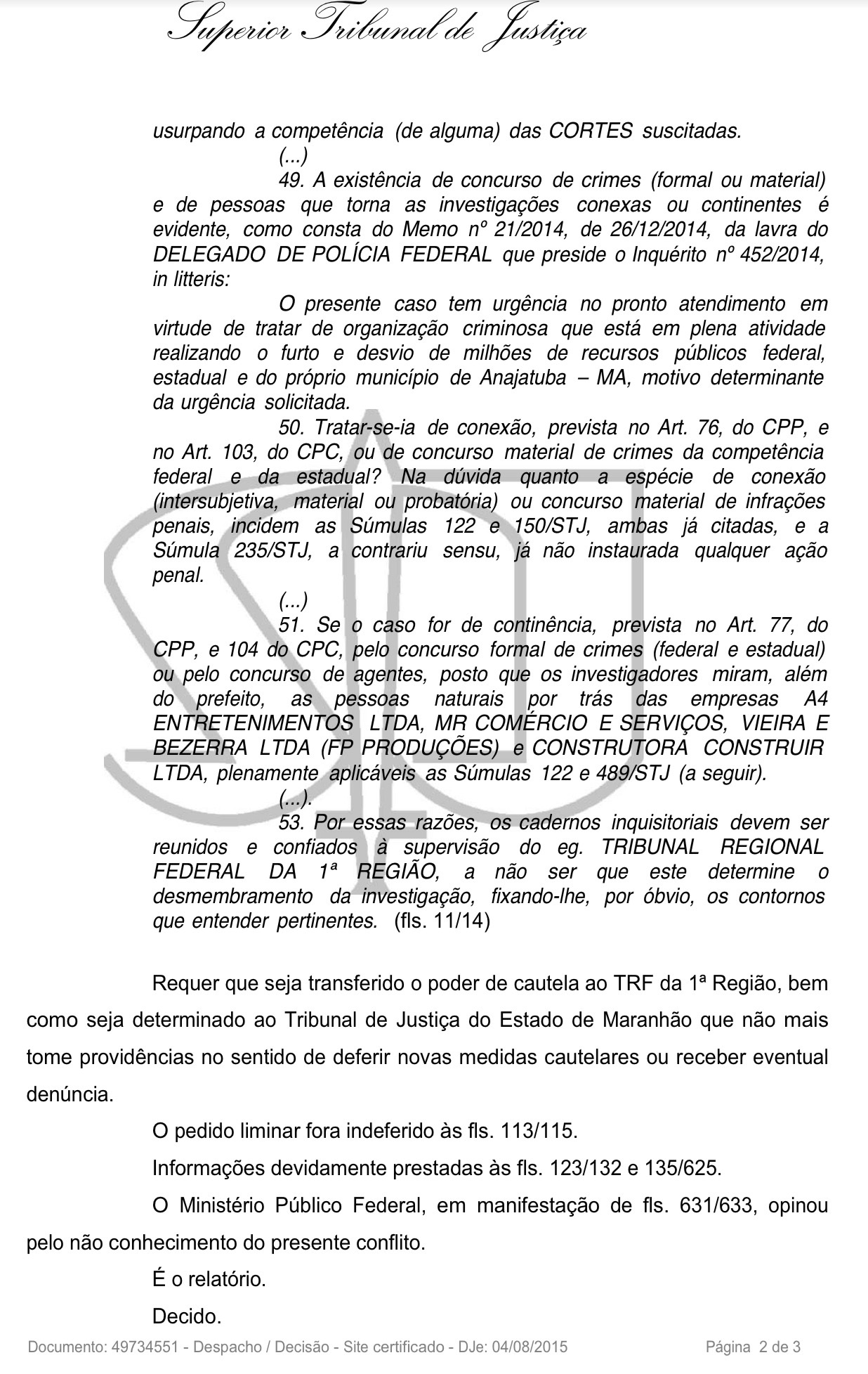 De pronto, com base nas informações fornecidas pelo Ministério Público Federal, o ministro relator rechaçou os argumentos da defesa, e assim se pronunciando: “O presente caso tem urgência no pronto atendimento em virtude de se tratar de uma organização criminosa que está em plena atividade realizando o furto e desvio de milhões de recursos públicos federal, estadual e do próprio município de Anajatuba, assim sendo, ante ao exposto, denego o conflito de competência suscitado”.