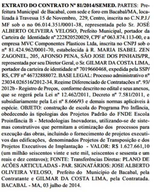 Fingindo obedecer as normas de licitação e ás tipologias dos projetos padrão do FNDE Escola Pro Infância, o prefeito agraciou a empresa MVC Componentes Plásticos Ltda, no dia 3 de julho de 2014. O montante do contrato é a exorbitante quantia de R$ 1.627.661,10 (hum milhão seiscentos e vinte e sete mil, seiscentos e sessenta e um reais e dez centavos).