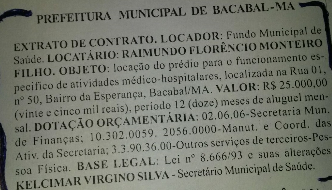De acordo com o extrato, o locatário Raimundo Florêncio Monteiro Filho, irmão do deputado Carlinhos Florêncio, vai receber mensalmente pelo aluguel R$ 25 mil reais. O hospital vai custar no prazo de 1 ano R$ 300 mil aos cofres públicos.
