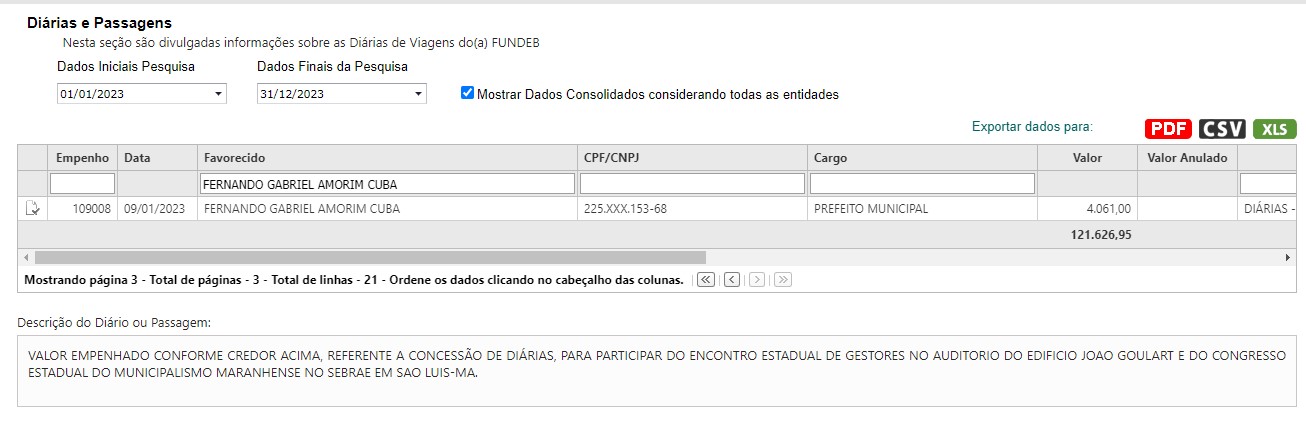 Segundo os dados, somente em agosto o gestor municipal recebeu R$ 10.558,60 mil referente a concessão de 4 diárias para que ele participasse da mobilização municipalista que foi realizada nos dia 15 e 16 daquele mês na sede da CNM (Confederação Nacional dos Municípios) em Brasília (DF).