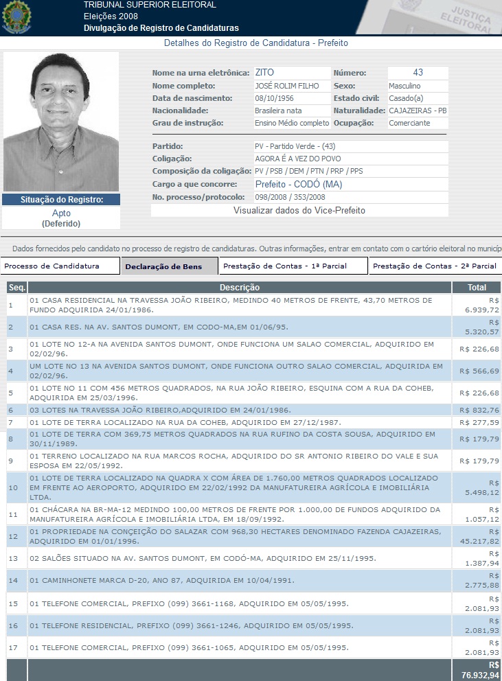 Em 2008 quando Zito Rolim se candidatou a prefeito de Codó, o republicano, apresentou ao TRE um patrimônio avaliado em quase R$ 77 mil, bens móveis e imóveis.