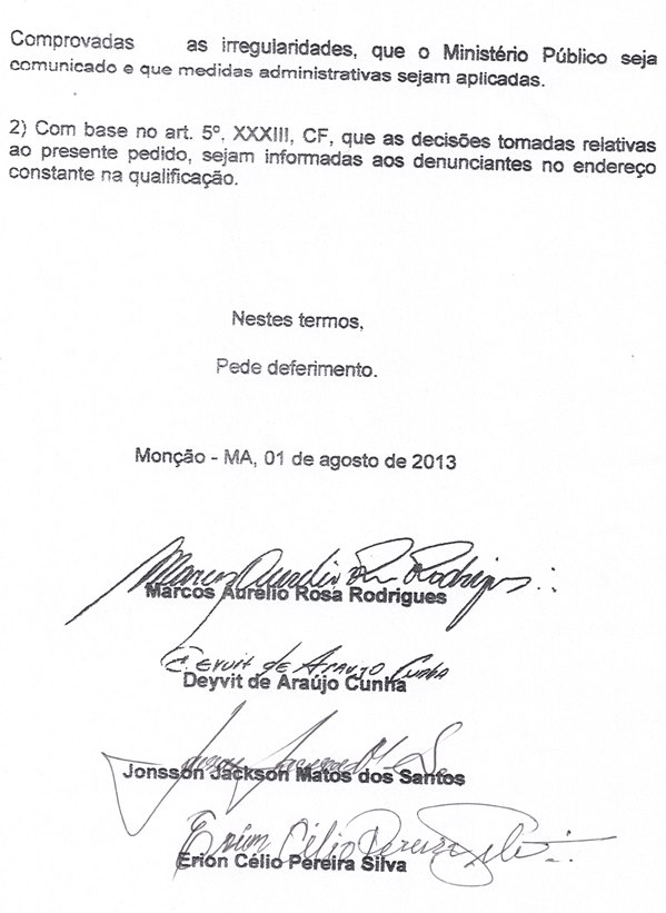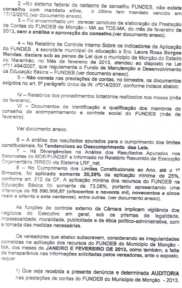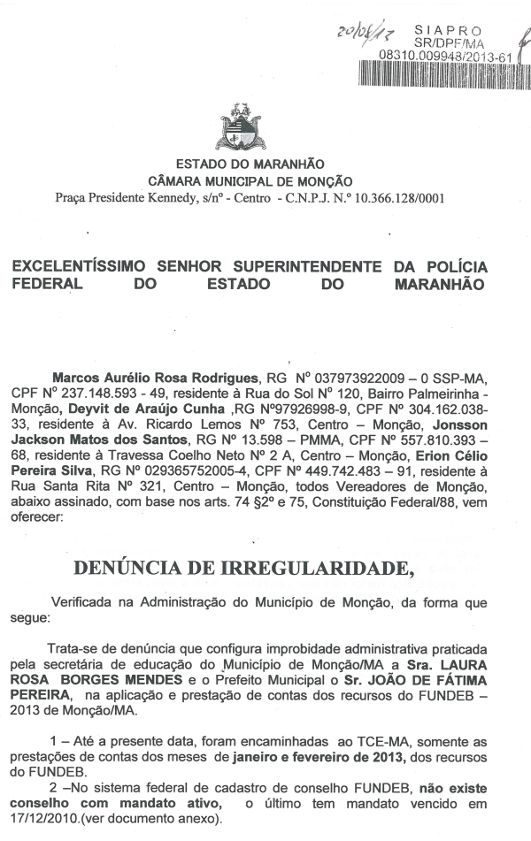 Além disso, foi pedido investigação e auditoria na Prefeitura de Monção que está sob suspeita de cometer atos que configuram improbidade administrativa. Confira abaixo a denúncia protocolada na Polícia Federal e Ministério Público Federal: