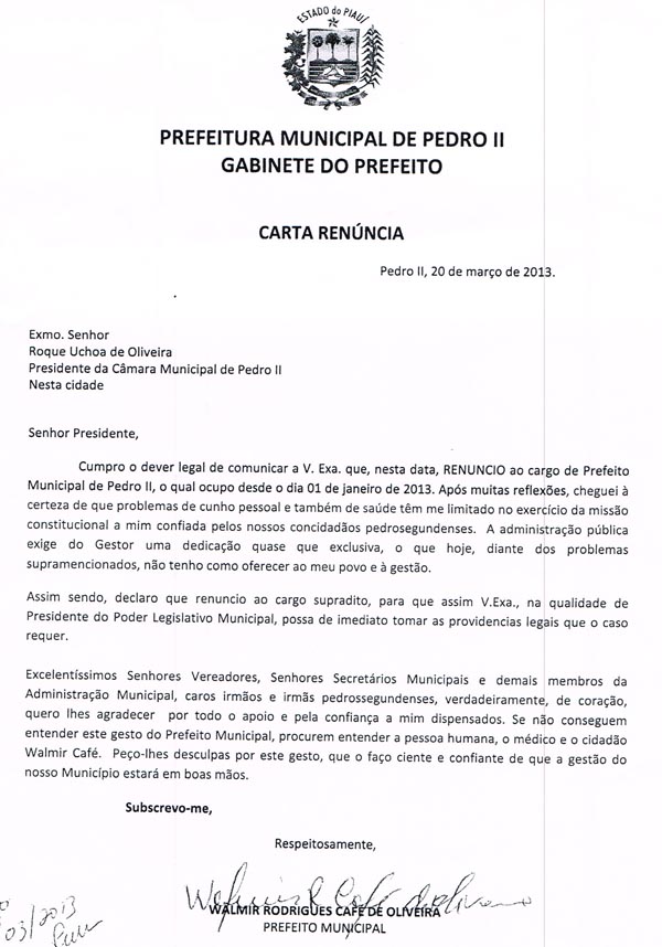 O prefeito de Pedro II Walmir Rodrigues Café de Oliveira, PSD, acaba de pedir a renúncia do mandato, em carta encaminhada hoje à Câmara Municipal da cidade.