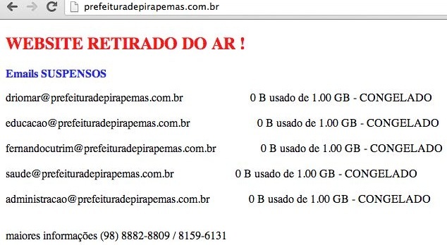 Quem precisa acessar o site da prefeitura de Pirapemas- MA em busca de qualquer informação simplesmente fica a ver navios. Ou melhor, quem acessa o endereço www.prefeituradepirapemas.com.br, se depara com a seguinte mensagem: “ fora do ar por falta de pagamento”.