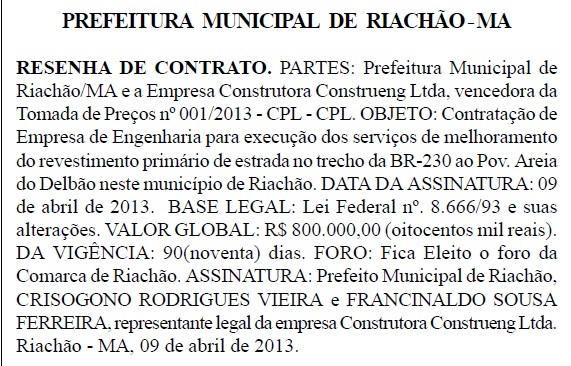 O prefeito da cidade de Riachão no sul do Maranhão, Crisógono Rodrigues Vieira, 61 anos, (PT do B), contratou a empresa Construtora Construeng Ltda, para execução dos serviços de melhoramento do revestimento primários de estrada no trecho da BR-230, que abrange o povoado Areia de Delbão.