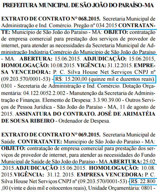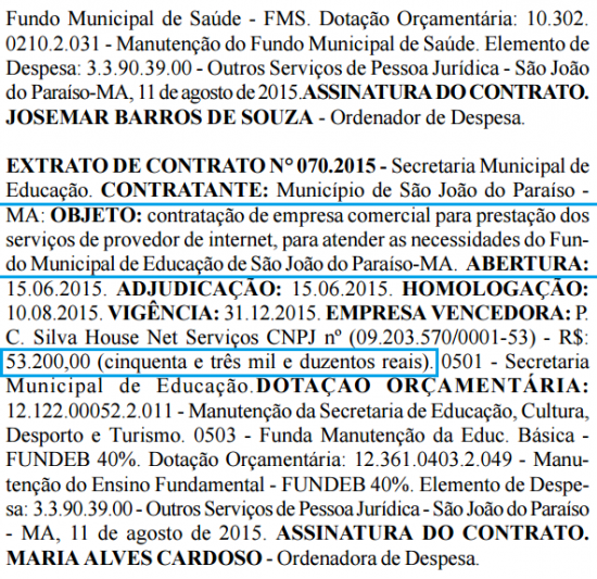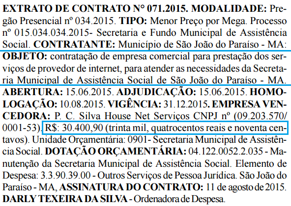 A empresa P.C. Silva House Net Serviços, com sede em Estreito-MA, será a responsável pelo fornecimento de dados dos contratos que tem vigência até dezembro de 2015.