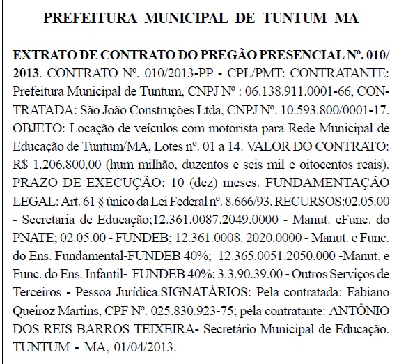 De número 010/2013, o extrato publicado do Diário Oficial do Estado no dia 17 deste mês diz que o valor a ser pago é referente a prestação de serviço de locação de veículos com motorista para Rede Municipal de Educação de Tuntum.