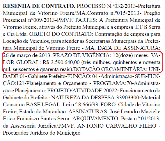 De número 032/2013, o extrato publicado do Diário Oficial do Estado diz que o valor a ser pago refere-se a prestação de serviço de locação de veículos para prefeitura e demais secretarias.