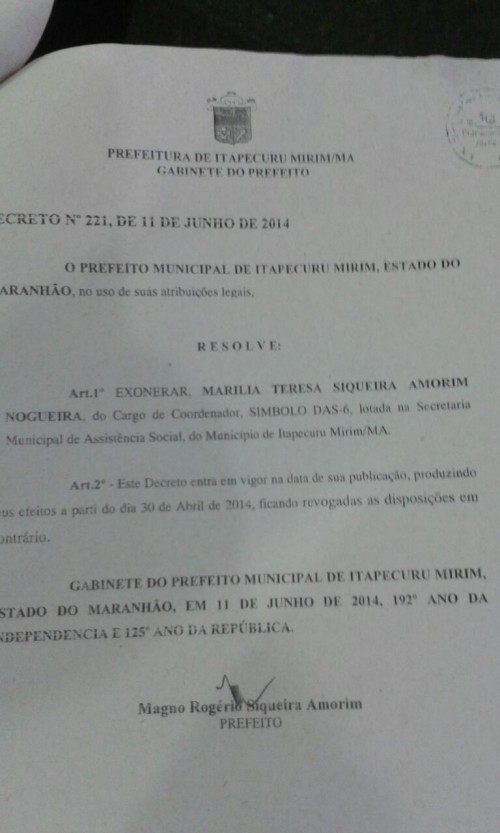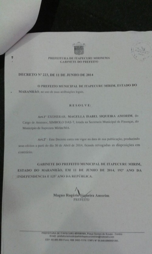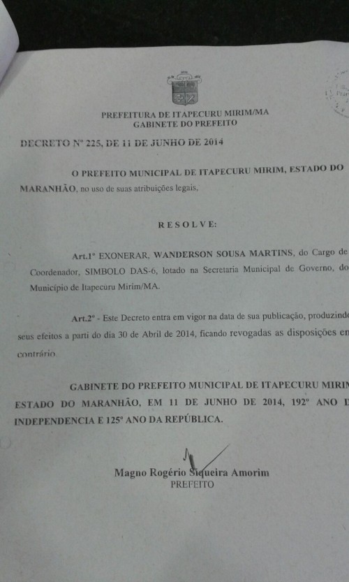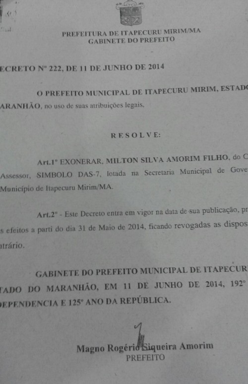 Acionado em 2014 pelo Ministério Público do Maranhão (MPMA), por atos de improbidade administrativa contra a prefeitura de Itapecuru-Mirim, Magno Amorim tentou, naquela época, diminuir sua “culpa no cartório”, quando exonerou cinco parentes que trabalhavam na prefeitura do munícipio.