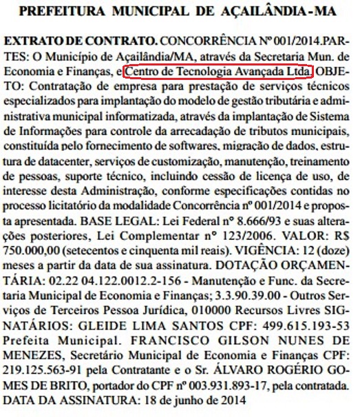 A prefeita de Açailândia, Gleide Santos, firmou mais um contrato altíssimo e dessa vez a empresa agraciada pela mesma foi Centro de Tecnologia Avançada Ltda, em um valor de R$ 750.000,00 (setecentos e cinquenta mil reais).