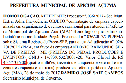O extrato do contrato revela que a empresa Freitas do Pedal Produções & Eventos, localizada no Maranhão Novo, em São Luís, foi a vencedora dos 2 lotes oferecidos pela Prefeitura e deve faturar nada menos do que R$ 4.357.356,00 (quatro milhões, trezentos e cinquenta e sete mil e trezentos e cinquenta e seis reais).