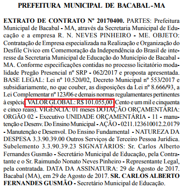Para realizar o evento do desfile cívico em comemoração da Independência do Brasil, a Prefeitura de Bacabal firmou um contrato bastante generoso com a empresa R.N.Neves Pinheiro-ME, que tem como nome fantasia Natel – Com.&Serviços e Telecomunicações.
