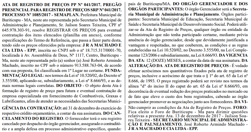 R$ 6.025.346,00 milhões . Esse é o valor exato que a Prefeitura de Buriticupu vai pagar à empresa J.R.A Machado e Cia Ltda, que tem como nome fantasia Auto Posto El-Shaday e é de propriedade de José Roberto Armindo Machado e Dieles Oliveira Machado.