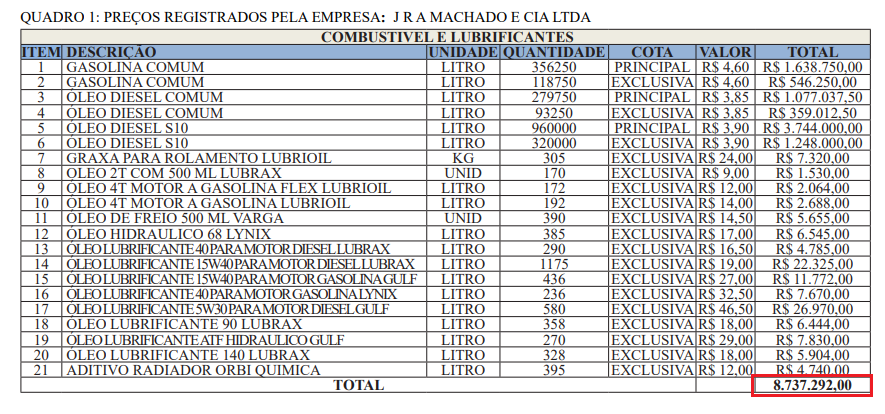 O contrato milionário de fornecimento foi firmado com a empresa R.A. Machado e Cia – Auto Posto El-Shaday, de propriedade de José Roberto Armindo Machado e Dieles Oliveira Machado.