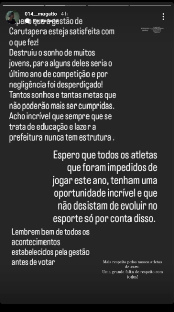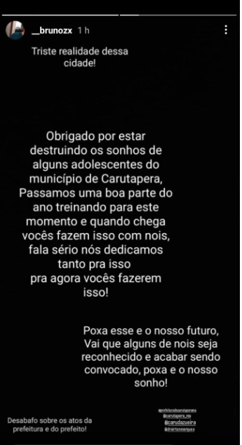 Em seus perfis pessoais, os atletas desabafaram e afirmaram que o prefeito Airton Santos destruiu o sonho de muitos jovens.