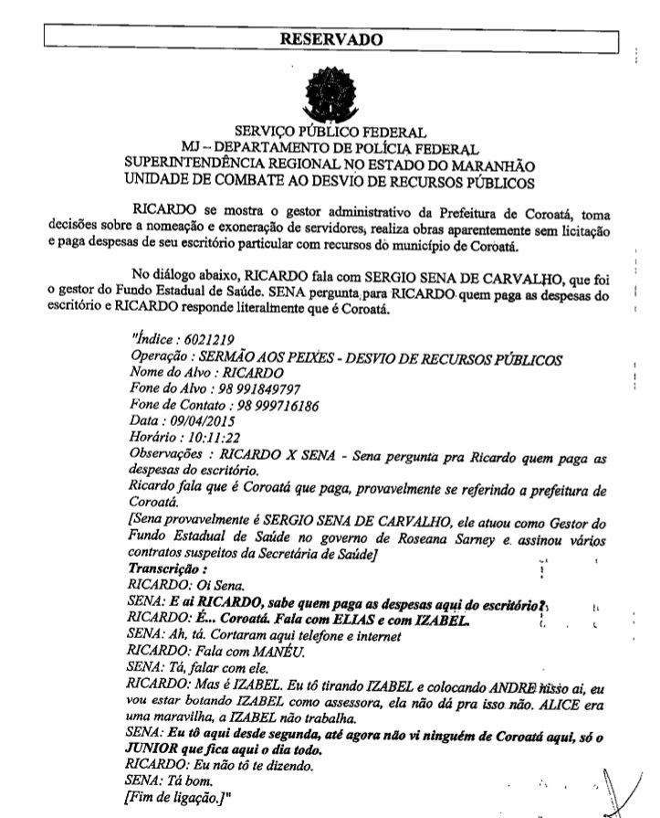 Na conversa é possível perceber claramente que Murad usa verbas da administração municipal de Coroatá para arcar com os gastos do seu escritório. Sérgio Sena pergunta a Ricardo quem paga as conta da empresa e ele responde: “É Coroatá.”