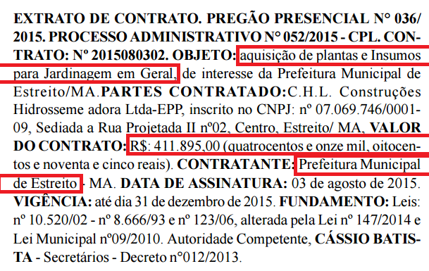 Os quase meio milhão de reais serão pagos a empresa C.H.L Construções Hidrosseme Adora Ltda., que fica na cidade e tem como atividade principal a construção de rodovias e ferrovias. O que parece estranho também, porque uma empresa não tem como atividade secundária o fornecimento de plantas e jardinagem.