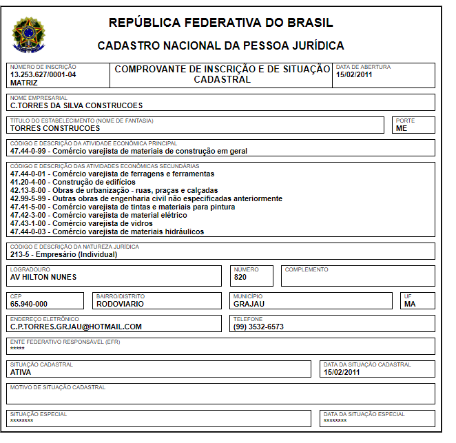 A empresa que irá fornecer os produtos é a Torres Construções, que fica localizada em Grajaú.