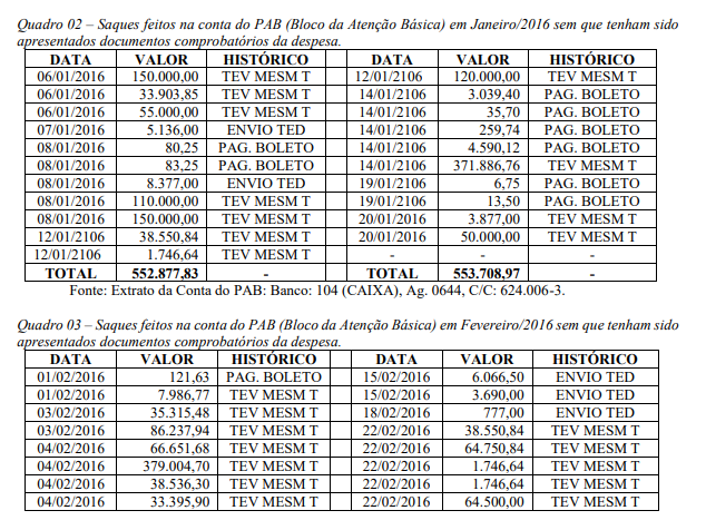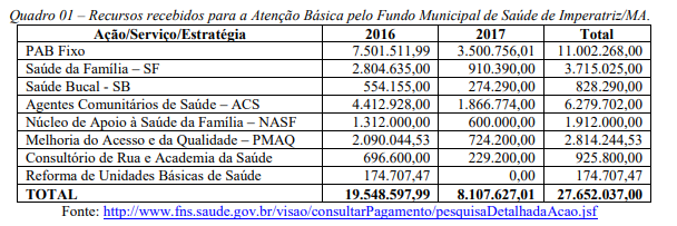 De acordo com o relatório, foi feita uma análise documental durante o período de 1º de janeiro de 2016 a 30 de junho de 2017 onde os auditores verificaram que o Fundo Municipal de Saúde de Imperatriz/MA recebeu o montante de R$ 27.652.037,00 (vinte e sete milhões seiscentos e cinquenta e dois mil e trinta e sete reais), relativo ao Bloco da Atenção Básica.