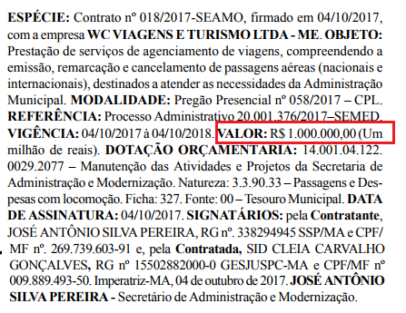 R$ 1.000.000,00 (Um milhão de reais). Esse é o valor exato que a Prefeitura de Imperatriz, por meio da Secretaria de Administração e Modernização, vai pagar para a empresa WC Viagens e Turismo Ltda-ME, localizada em Açailândia.