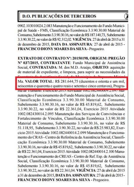 Assinado pelo prefeito Magno Rogério Siqueira Amorim, o contrato com um valor exorbitante de material de limpeza é, no mínimo, estranho.