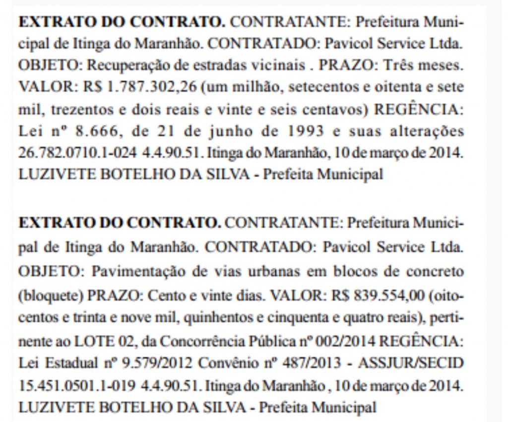 A responsável por todos estes contratos milionários, assinados no dia 10 de março de 2014, é a prefeita Luzivete Botelho da Silva. Abaixo você acompanha ao extrato de contrato referente a empresa Pavicol Service Ltda.