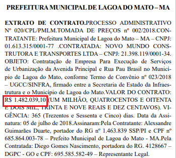 O valor que a empresa vai abocanhar da Prefeitura de Lagoa do Mato é de R$ 1.482.039,10 (UM MILHÃO, QUATROCENTOS E OITENTA E DOIS MIL, TRINTA E NOVE REAIS E DEZ CENTAVOS).