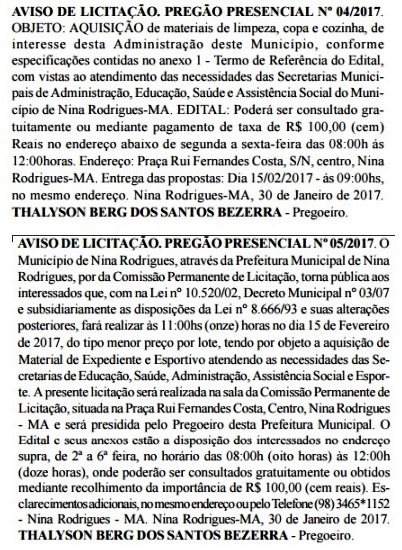 Um suposto direcionamento de licitação pode está ocorrendo na Prefeitura de Nina Rodrigues, que é comandada por Raimundo Aguiar Rodrigues Neto, o Rodrigues da Iara.