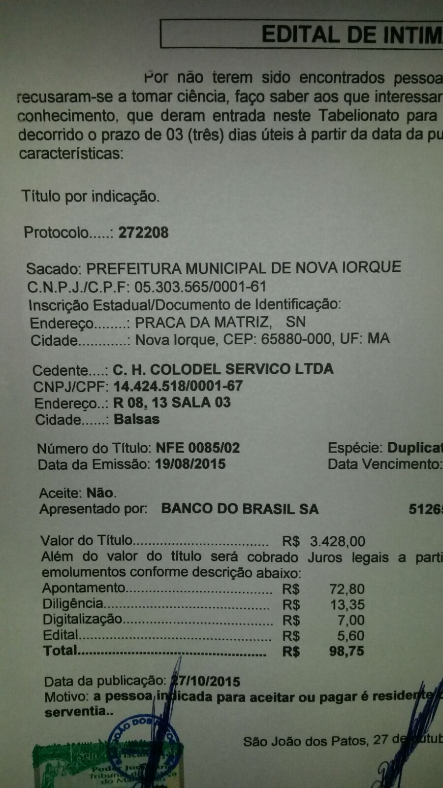 Foi encontrada, no Cartório do município de São João dos Patos, uma nota onde consta um débito em nome da Prefeitura da cidade de Nova Iorque do Maranhão. A dívida já está no SERASA.