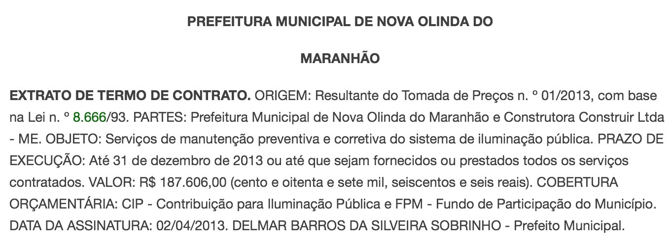 A gestão de Sobrinho contratou com a Construtora Construir Ltda., para a realizar serviços de manutenção preventiva e corretiva do sistema de iluminação pública. O enoresa faturou R$ 187.606,00 (cento e oitenta e sete mil, seiscentos e seis reais).