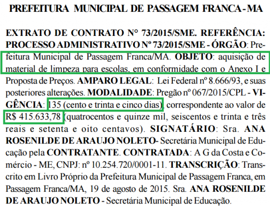 Não precisa ir muito longe. No município de Passagem Franca, à 409km da capital São Luís, a prefeitura vai pagar R$ 415.633,78 mil por materiais de limpeza para atender a demanda das escolas da cidade por 135 dias.