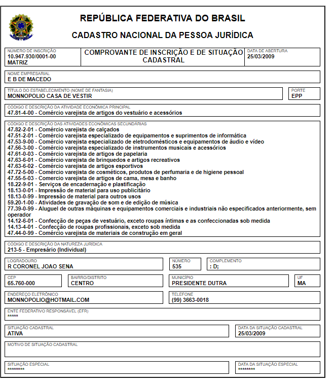 A Prefeitura de Presidente Dutra contratou a E.B. de Macedo-Me, de nome fantasia Monnopólio Casa de Vestir, por cifras milionárias.
