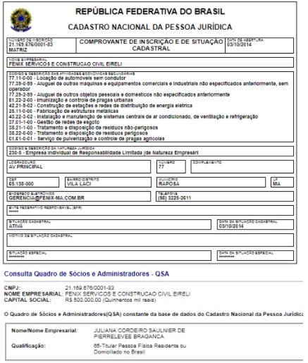 Localizada no município de Raposa, a empresa tem como proprietária Juliana Cordeiro Saulnier de Pierrelevee Bragança.
