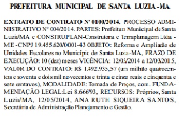 De acordo com o Diário Oficial do dia 15 de Julho deste ano, a empresa CONSTRUPLAN – Construtora e Terraplanagem Ltda – ME firmou um contrato com a prefeitura administrada por Vernonildo Tavares dos Santos, o Vera (PRB), porém o contrato foi assinado pela secretária de administração planejamento e gestão, Ana Ruth Siqueira Santos.