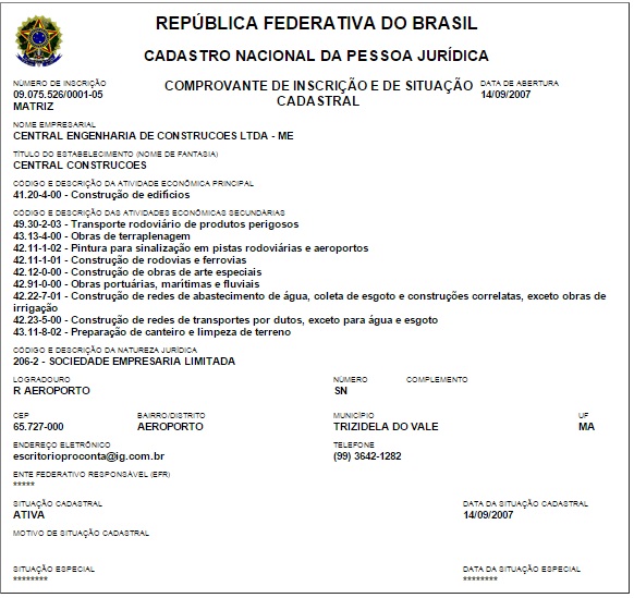 Registrada na Receita Federal na cidade maranhense de Trizidela do Vale, a Central estaria funcionando irregularmente no município de Paço do Lumiar, onde funciona a usina de asfalto.