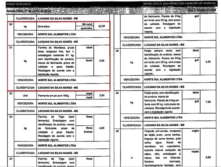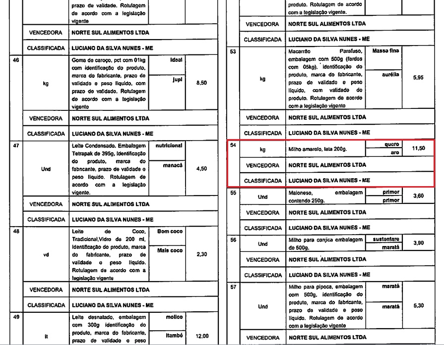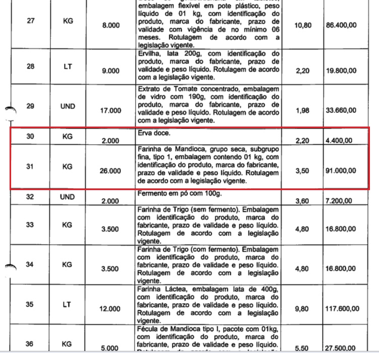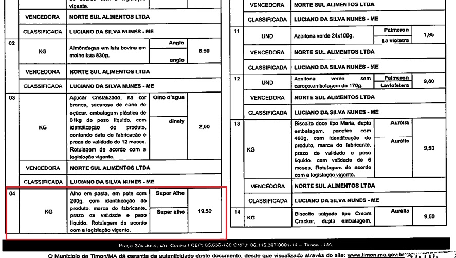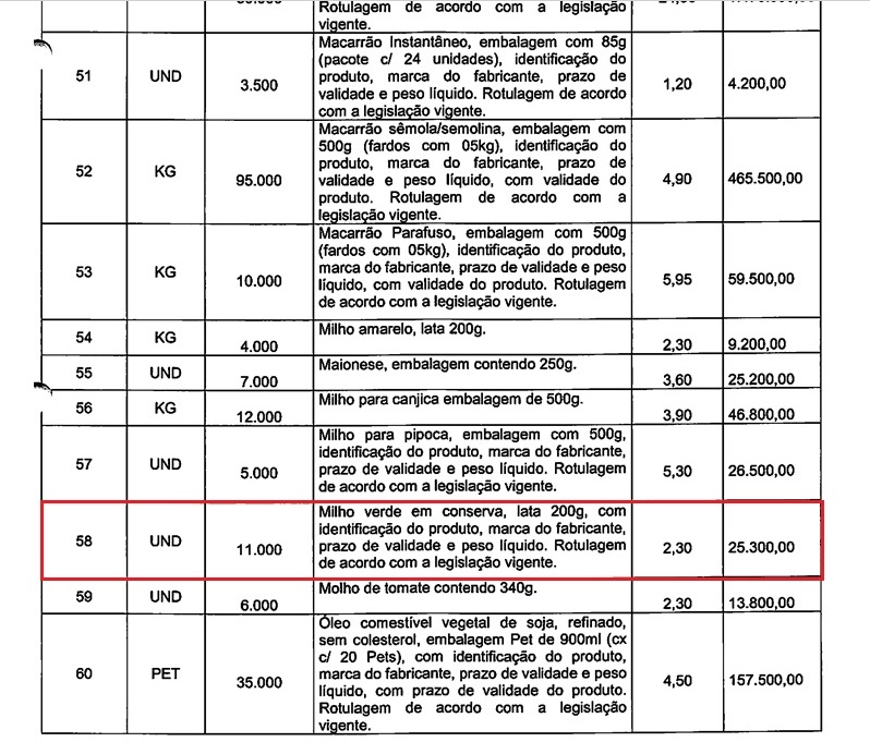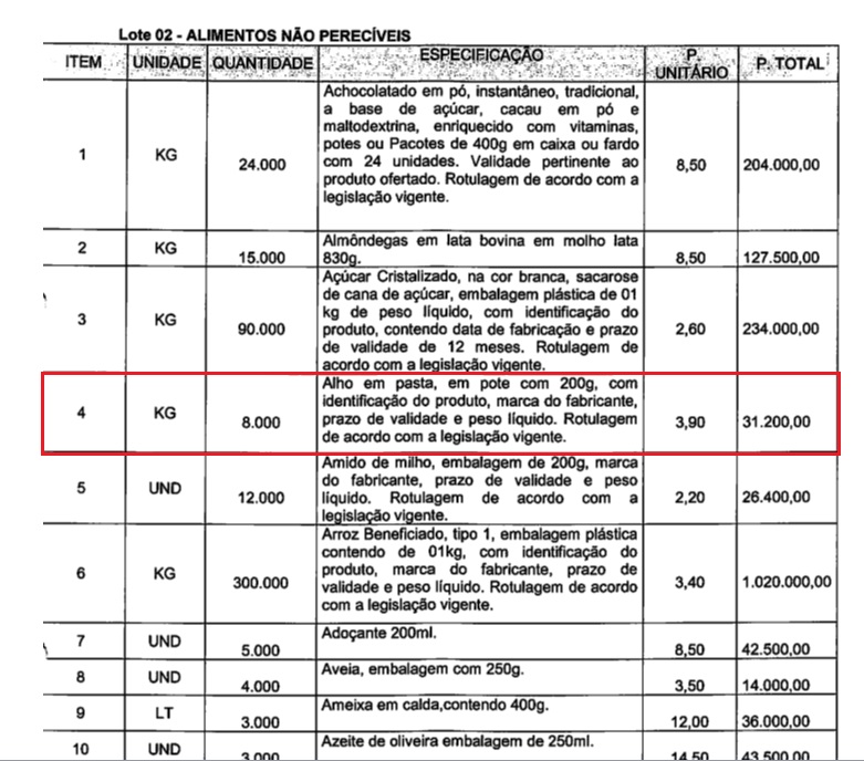 Por exemplo, o produto alho em pasta, a pesquisa de mercado apurou o valor de R$ 3,90, e o valor registrado na ata final foi R$ 19,50; o produto erva doce, a pesquisa de mercado apurou o valor de R$ 2,20, e o valor registrado na ata final foi R$ 22,00; a farinha de mandioca, a pesquisa de mercado apurou o valor de R$ 3,50, e o valor registrado na ata final foi R$ 5,80; o milho amarelo lata 200g, a pesquisa de mercado apurou o valor de R$ 2,30, e o valor registrado na ata final foi R$ 11,50.