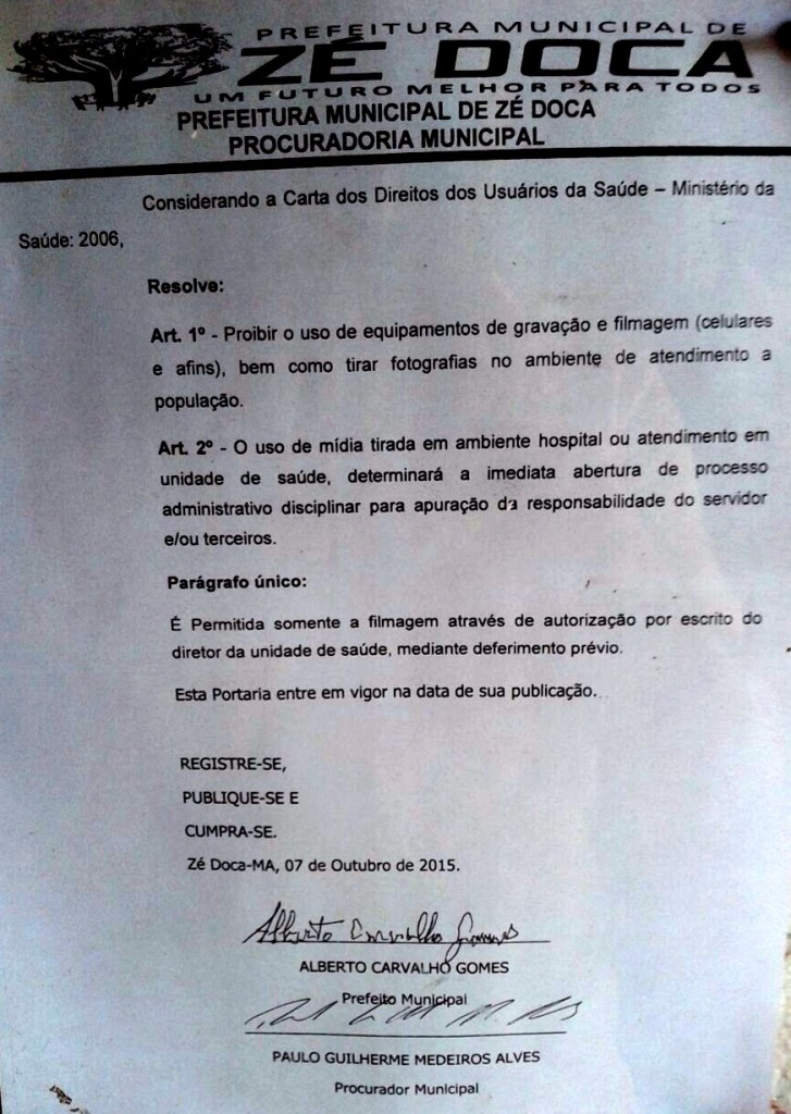 Prefeitura de Zé Doca proíbe divulgação da precariedade na Saúde