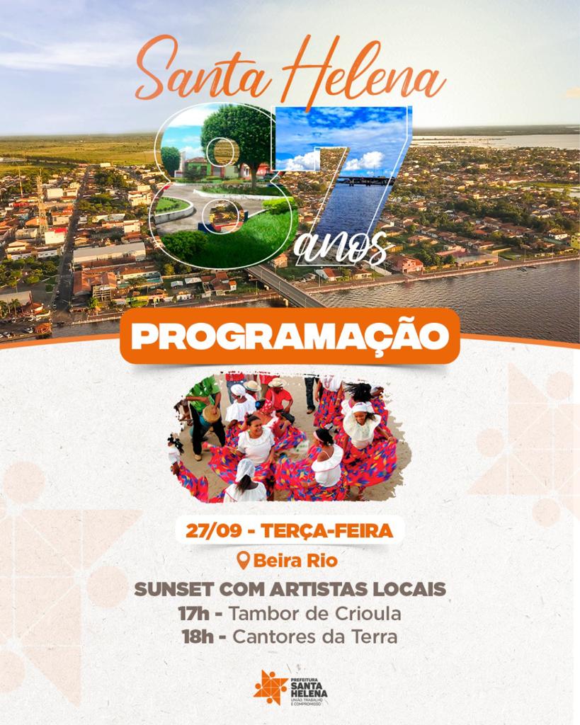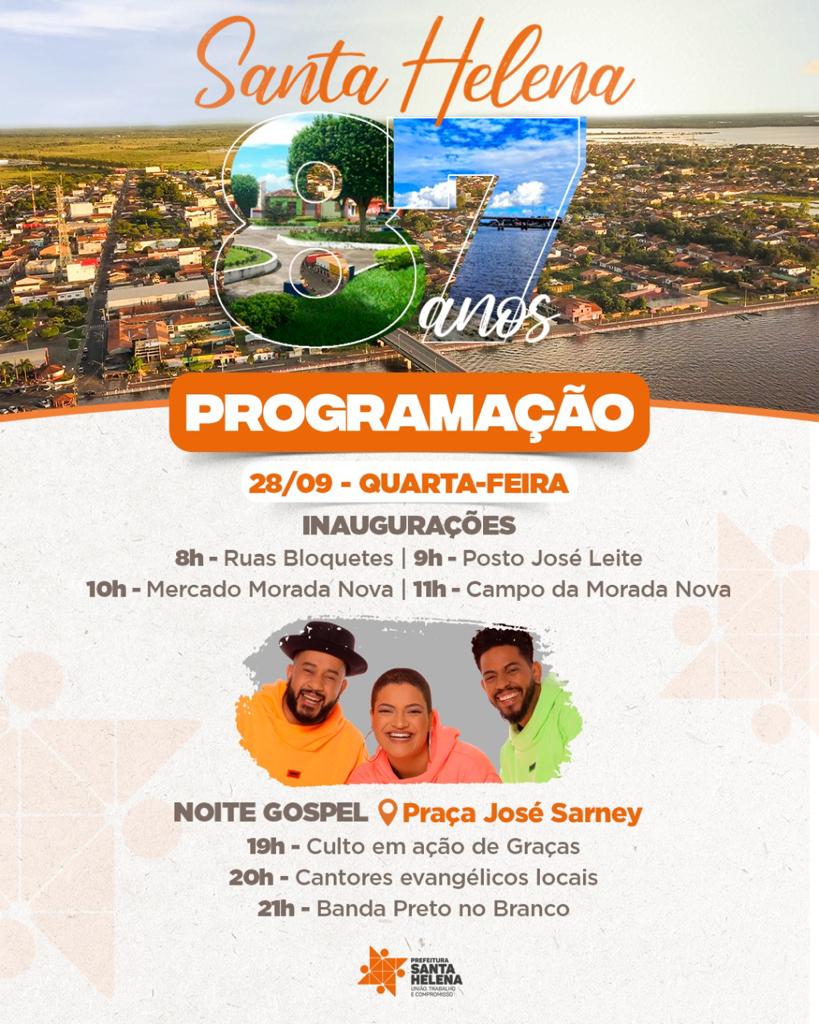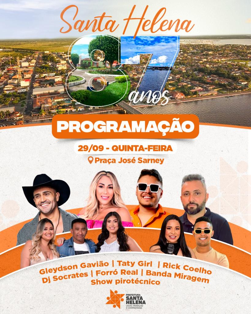 No dia 29, véspera do aniversario de Santa Helena, atrações de peso se apresentarão na Praça José Sarney: Gleydson Gavião, Rick Coelho, Dj Sócrates, Forró Real, Banda Miragem e a super cantora Taty Girl. No dia 30, a programação tem início bem cedo, às 06 horas, com Alvorada, hasteamento das bandeiras, missa, às 08h30, na Igreja Matriz e às 09h30, o tão esperado corte do bolo.